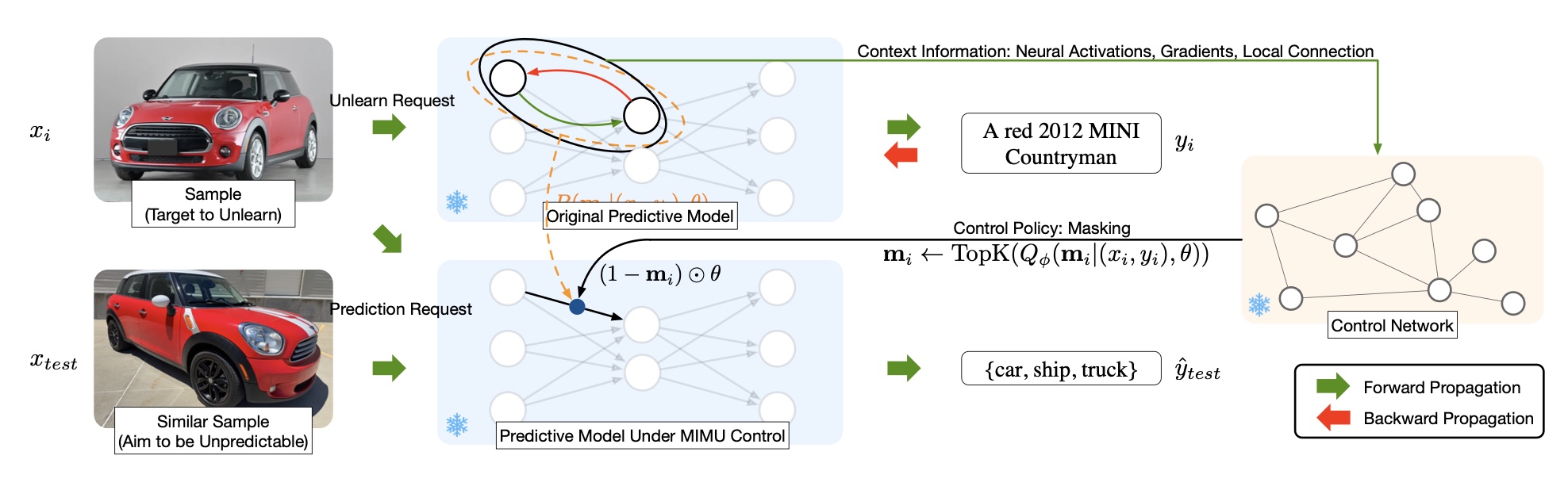 MIMU learns a binary masking policy that identifies exactly those weights. Forgetting is enforced through the prediction-alignment requirement: