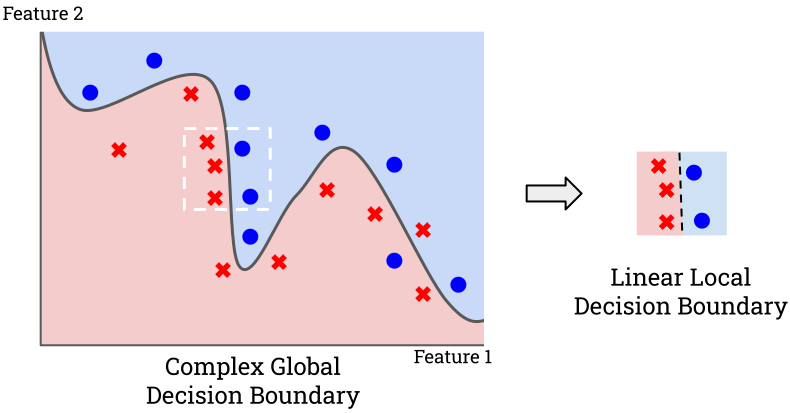 Local explanation methods are often designed to be model-agnostic and feature-based so that they can apply across different ML algorithms. These methods interpret behavior by analyzing the importance of input features for a given prediction. One popular method is Local Interpretable Model-agnostic Explanations (LIME) which aims to provide explanations that preserve local fidelity — that the explanations correspond to the model’s actual behaviour. LIME’s explanations take the form of a sparse linear model which approximates the complex model around the input datapoint. The weights of the linear model communicate how important each corresponding feature is.