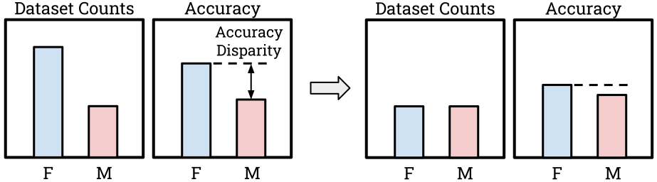 Privacy 📈 → Fairness 📉: While DP-SGD is the de facto standard method for achieving privacy guarantees on ML models, it is well known to cause Disparate Impact by increasing accuracy disparity. In ordinary SGD, datapoints from an underrepresented group have higher loss, and hence larger gradients, which increases their relative influence on the optimization to naturally balance the model’s performance. In DP-SGD large gradients are clipped, making them relatively less influential on the optimization process, causing underrepresented groups to be “ignored”.